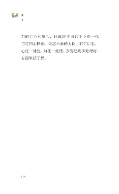 ?孟 子 君的仁心和决心,还取决于国君手下有一批 与之同心同德、矢志不渝的大臣。君仁臣忠, 心往一处想,劲往一处使,方能把政事处理好, 方能取信于民。 114