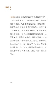 ?孟 子 【解读】本章孟子讲的是如何理智地践行“道”, “在迩而求诸远”“在易而求诸难”都是不 明智的做法,凡事不要舍近求远,舍易求难, 将简单的问题复杂化是不可取的。实现仁义 之道并不难,人人从自身做起,从力所能及 的小事做起。每个人都遵循仁义的原则,从 孝敬父母、尊敬长辈做起,再延伸到他人(如 孟子所说的“老吾老以及人之老,幼吾幼以 及人之幼”),天下就太平了。孟子在这里 告诉我们,践行道义大可不必好高骛远,把 道义看得那么神圣高远,其实“道”就在你 身边。 196