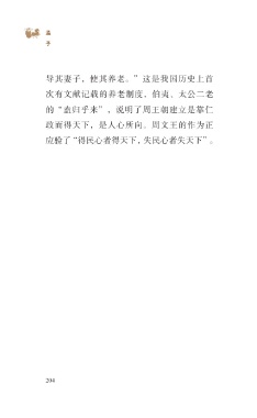 ?孟 子 导其妻子,使其养老。”这是我国历史上首 次有文献记载的养老制度,伯夷、太公二老 的“盍归乎来”,说明了周王朝建立是靠仁 政而得天下,是人心所向。周文王的作为正 应验了“得民心者得天下,失民心者失天下”。 204
