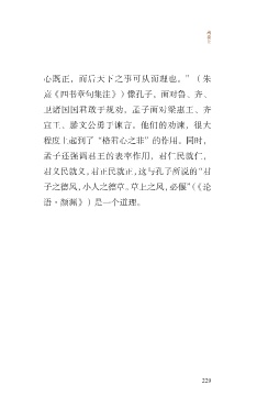离 娄 上 心既正,而后天下之事可从而理也。”(朱 熹《四书章句集注》)像孔子,面对鲁、齐、 卫诸国国君敢于规劝,孟子面对梁惠王、齐 宣王、滕文公勇于谏言。他们的劝谏,很大 程度上起到了“格君心之非”的作用。同时, 孟子还强调君王的表率作用,君仁民就仁, 君义民就义,君正民就正,这与孔子所说的“君 子之德风,小人之德草。草上之风,必偃”(《论 语·颜渊》)是一个道理。 229