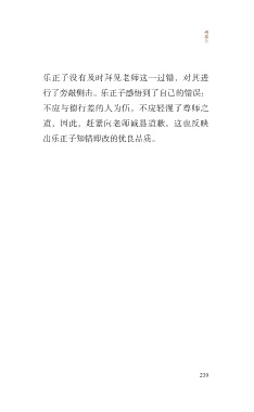 离 娄 上 乐正子没有及时拜见老师这一过错,对其进 行了旁敲侧击。乐正子感悟到了自己的错误: 不应与德行差的人为伍,不应轻慢了尊师之 道,因此,赶紧向老师诚恳道歉。这也反映 出乐正子知错即改的优良品质。 239