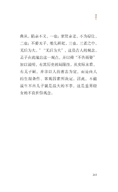 离 娄 上 曲从,陷亲不义,一也;家贫亲老,不为禄仕, 二也;不娶无子,绝先祖祀,三也。三者之中, 无后为大。”“无后为大”,这是古人的观念, 孟子在此抛出这一观点,并以舜“不告而娶” 加以说明,有其历史的局限性。从实际来看, 有无子嗣,并非以人的意志为定,而是由人 的生理条件、客观因素所决定。因此,不能 说生不出儿子就是最大的不孝,这是重男轻 女的不良世俗观念。 243