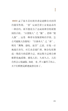 离 娄 下 【解读】孟子在本章向统治者论述修身对治国 的重要作用。“善”应该是君王自觉追求的 一种目的,而不能是为了达成某种目的而使 用的手段。“以善服人”之“服”,意即“使 人服”,这是一种带有强制意味的手段,怎 么可能使人信服呢?“以善养人”之“养”, 则有“熏陶、感化、滋养”之意,日复一日 地施以善行,对民众普施仁政,便会慢慢聚 成一股强大的道德力量,而这股力量则会潜 移默化地熏陶、感化人们,久而久之,人们 自然会心悦诚服。如此一来,君王赢得了民心, 天下归顺便是顺理成章的事了。 291