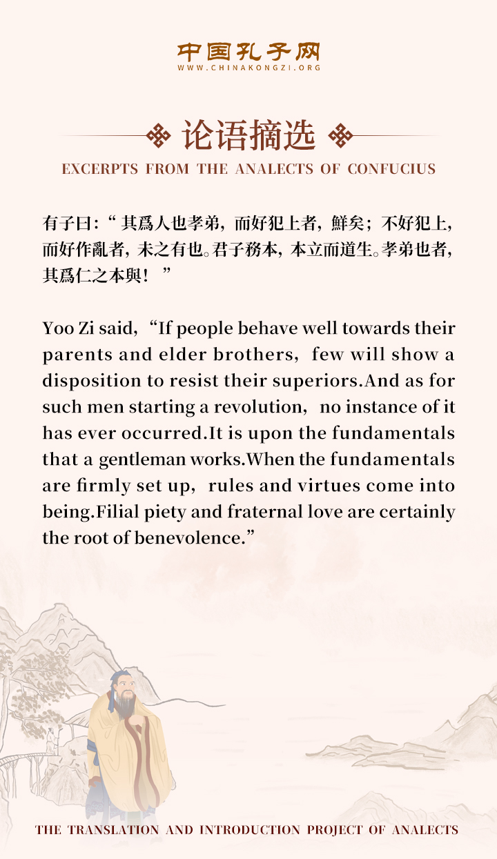 Yoo Zi said,“If people behave well towards their parents and elder brothers,few will show a disposition to resist their superiors.And as for such men starting a revolution,no instance of it has ever occurred.It is upon the fundamentals that a gentleman works.When the fundamentals are firmly set up,rules and virtues come into being.Filial piety and fraternal love are certainly the root of benevolence.”