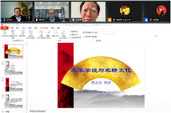 2020年10月16日,由山东大学儒学高等研究院、山东大学研究生院共同主办的“尼山国学大讲堂”(第四十五讲)在腾讯会议线上举行。国家社科基金历史组评审专家、农业部全球重要农业文化遗产中国项目专家委员会委员、教育部高等学校教学指导委员会委员,西北农林科技大学中国农业历史文化研究中心教授、博士生导师樊志民应邀以“道家学说与农耕文化”为题做学术报告。第十三届全国政协常委、山东大学儒学高等研究院执行院长、《文史哲》杂志主编、山东大学讲席教授王学典主持了学术讲座。来自全国各高等院校、科研院所的100余名师生聆听了此次讲座。