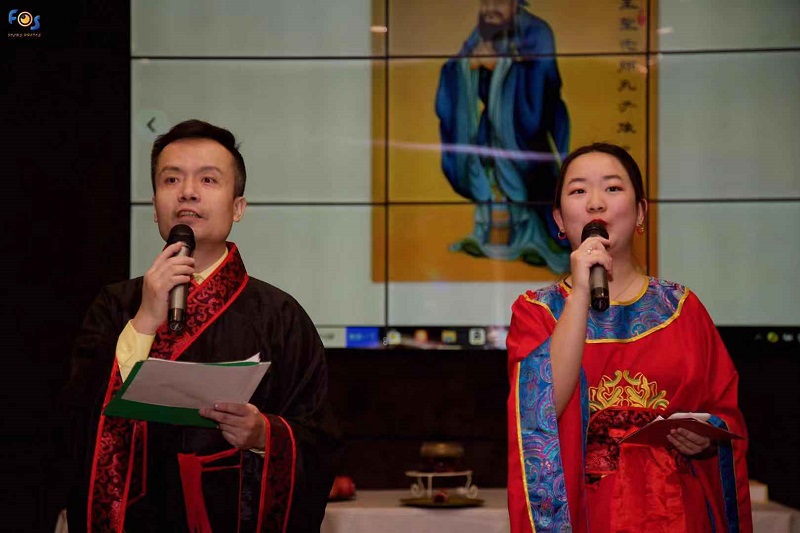 主祭人和嘉宾佩戴祭孔黄色围巾登场,向孔子像敬献花篮。三揖三躬,宣读祭文。谨怀无限崇敬之心,略备果蔬薄馔,恭祭于至圣先师之灵。