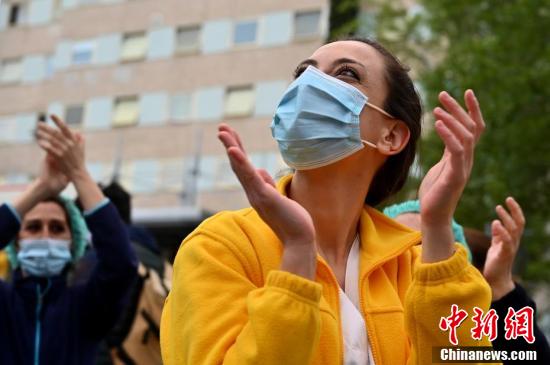 当地时间4月27日,在西班牙马德里的一家医院外,医护人员在为全国禁闭期间居家隔离的民众们鼓掌欢呼,为他们加油打气。