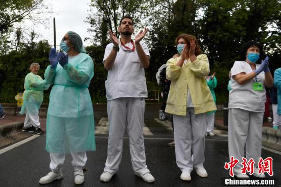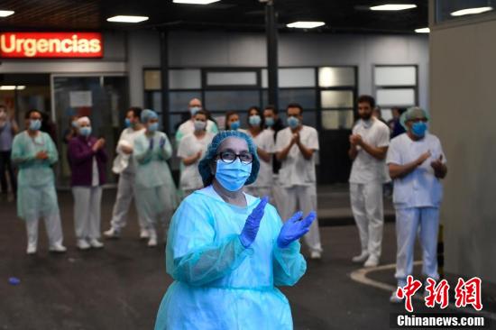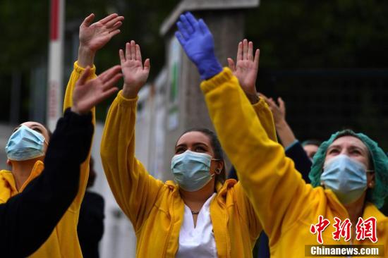 西班牙医护人员为禁闭在家的民众鼓掌加油