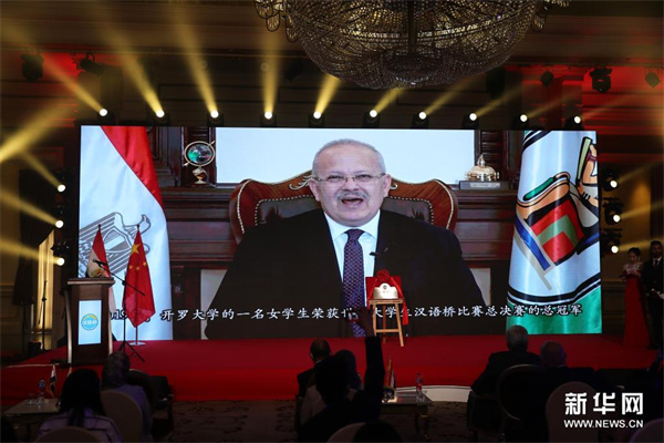 6月15日,埃及开罗大学校长穆罕默德·奥斯曼·霍希特通过线上方式参加“汉语桥”俱乐部开罗站揭牌仪式。新华社记者 王东震 摄