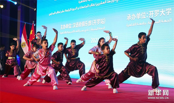 6月15日,学生在埃及开罗的“汉语桥”俱乐部开罗站揭牌仪式现场表演武术。新华社记者 王东震 摄