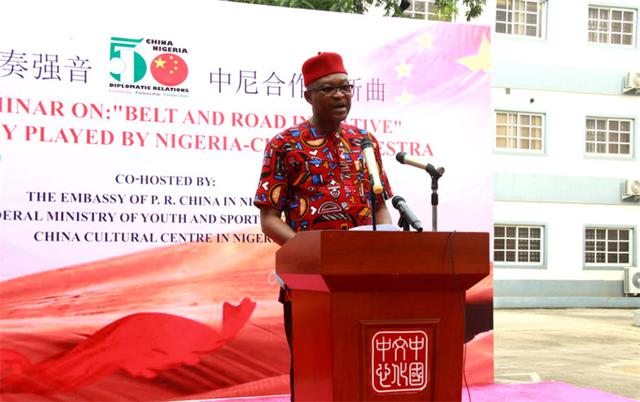 当地时间19日,中国驻尼日利亚使馆携尼青年和体育发展部、中国文化中心共同主办的“一带一路奏强音,中尼合作谱新曲”研讨会在中国文化中心举办。驻尼日利亚大使崔建春、使馆公使衔参赞赵勇、文化参赞兼中国文化中心主任李旭大,尼青年和体育发展部常秘阿纳考、尼国家艺术文化理事会主席伦赛维、尼教育部奖学金局局长阿斯塔、阿布贾大学法学及当代中非研究院院长谢里夫等近百人出席活动。