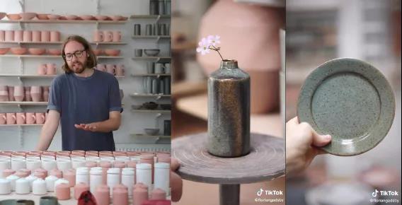 很多TikTok的陶艺师也受到中国陶瓷影响。英国创作者@Florian Gadsby是一名陶艺师,目前TikTok账号拥有140万粉丝。Florian极其喜爱中国古代陶器,尤其是宋代的龙泉青瓷和官窑。宋瓷简单、优雅的设计,以及微妙的釉料和颜色,对Florian的陶瓷创作影响很深。他的陶瓷作品器型简洁,多为低饱和度的纯色。