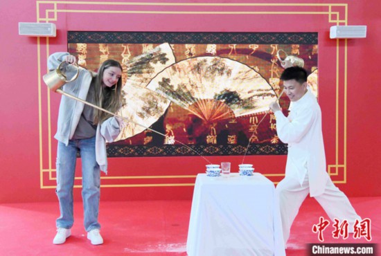 图为当地民众在现场体验“长嘴壶茶艺”。 中新社记者 李洋 摄
