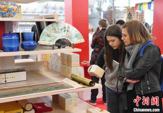 图为当地民众在“文化产品展示区”观赏展品。 中新社记者 李洋 摄