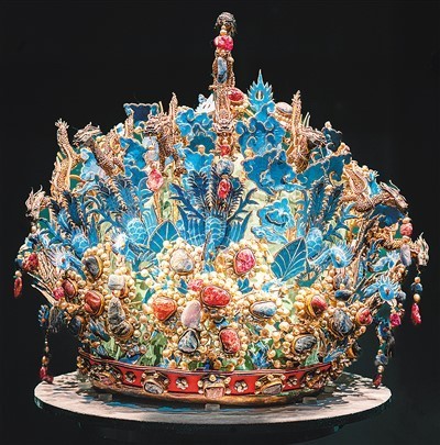 明清时期,各色宝石随着跨洋贸易进入中国,镶嵌宝石饰品渐成风尚。北京定陵出土的明万历孝靖皇后十二龙九凤冠是中国目前仅存的4顶明代凤冠之一,采用了当时最为精巧的点翠嵌珍珠宝石工艺。此凤冠以漆竹扎成帽胎,正面饰有8条金龙,下有5只金凤,背部有4条金龙,两侧各有2条金凤。龙凤均口衔珠宝串饰,二者之间插饰翠云、翠叶。全冠共镶嵌天然宝石100余粒、珍珠3500余颗,宝石颗粒均匀,形状各有不同,色彩鲜艳明丽。此次展览是其首次离京展出,让广大观众一览明代宫廷制作的顶级工艺。