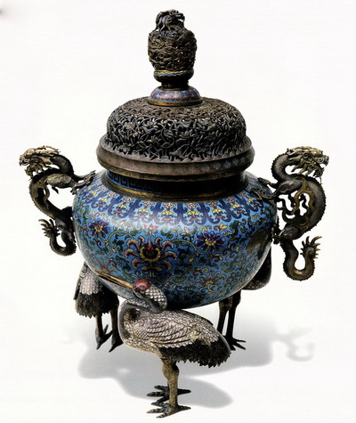 纏枝蓮紋掐糸琺瑯鶴足炉 明