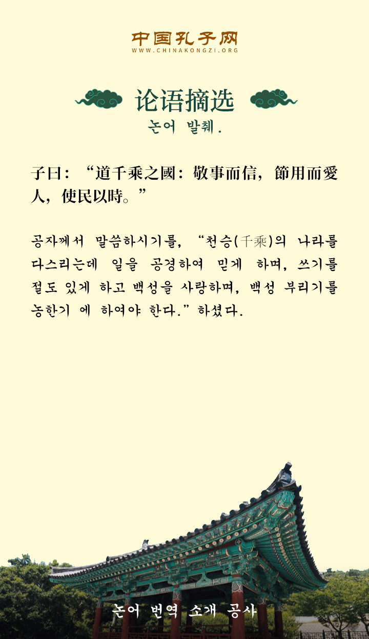 공자께서 말씀하시기를,“천승(千乘)의 나라를 다스리는데 일을 공경하여 믿게 하며,쓰기를 절도 있게 하고 백성을 사랑하며,백성 부리기를 농한기 에 하여야 한다.”하셨다.