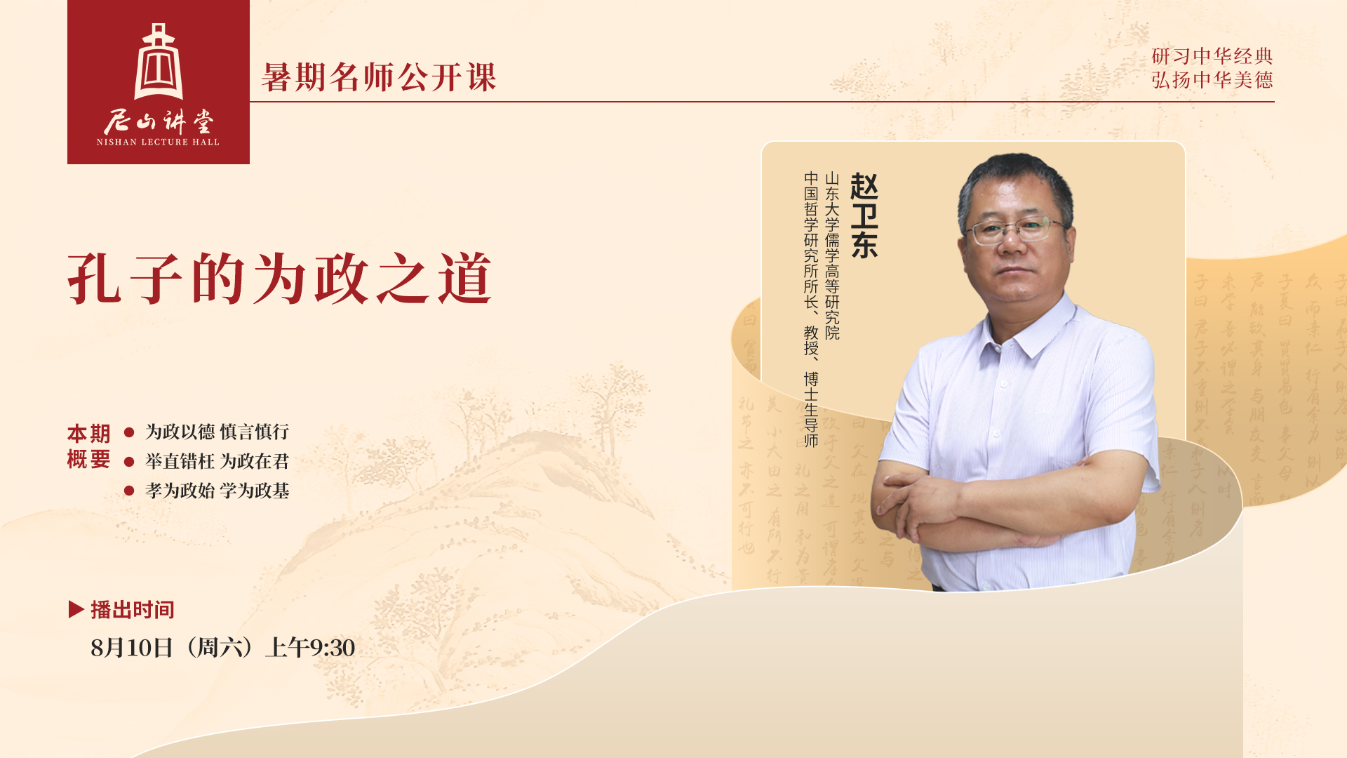 “尼山讲堂”精品公益项目由尼山世界儒学中心、中国孔子基金会特别策划推出,邀请海内外专家学者以“研习中华经典·弘扬中华美德”为主题,深入挖掘中华经典中的思想内容,每周一期,通过直播或录播方式在各大主流媒体平台播出,打造大众化、生活化、国际化的传播普及文化阵地。