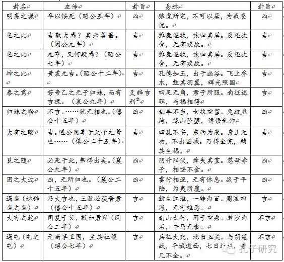 《左传》占筮案例和《易林》卦旨的吉凶走势也具有一致性。《左传》庄公二十二年,一位周史为陈侯占,遇《观》之《否》卦,周史曰:“是谓‘观国之光,利用宾于王。此其代陈有国乎?” 这里的卦旨呈现吉利状,代陈有国是能成为一国之君的推测。相应的林辞《观》之《否》写道:“青牛白咽,招我于田。历山之下,可以多耕。岁藏时节,人民安宁。”历山是有名的神山,相传虞舜曾在此耕种,《灵棋经》记载:“舜躬耕田,至于历山。土沃年丰,岁取十千。” 以历山稼穑为编撰对象,描写的也是一幅顺时和乐的景象,卦旨同样吉利。《左传》引易占筮的筮例和对应林辞卦旨吻合的情况不是偶然的,而是普遍的,另外的筮例对应情形如下表所示:
