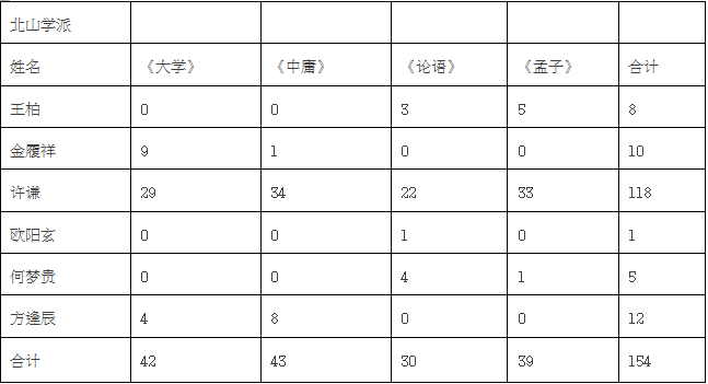 征引量共计154条。北山一系学人的著作如今多数已经不传,《四书大全》征引其说,无疑是极为珍贵的材料,尤其是在朱学发展当中,北山一脉具有衔接朱门与后学的作用,对此后人深有共识,吴师道为许谦《读四书丛说》撰序言之甚明,其云: