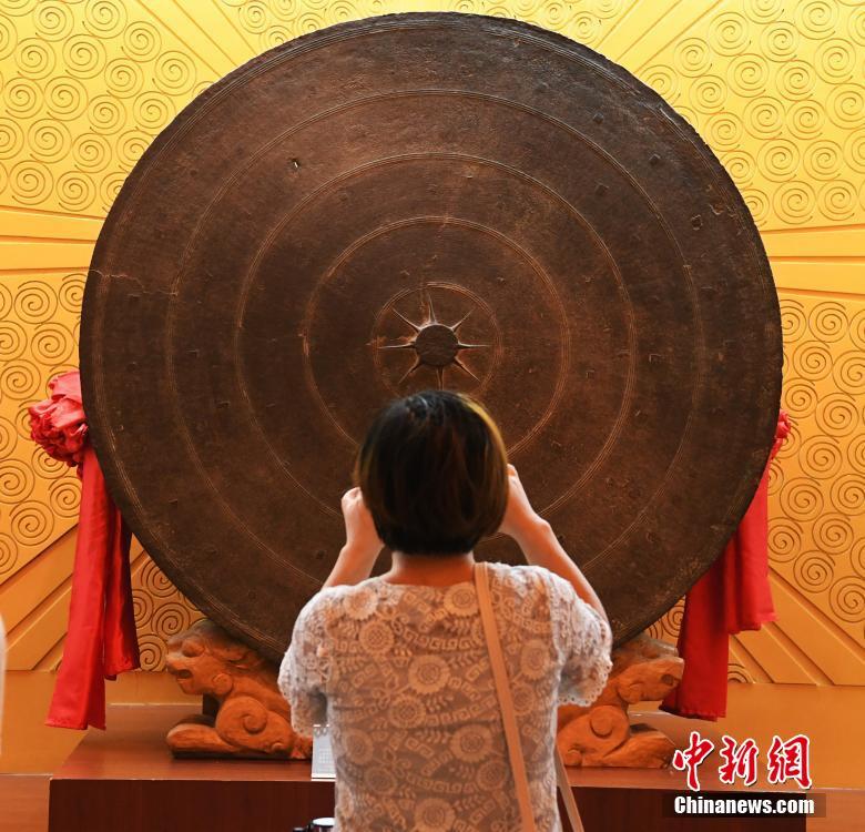 7月25日,广西民族博物馆内,“铜鼓王”云雷纹大铜鼓吸引市民驻足观看。云雷纹大铜鼓出土于广西北流,面径165厘米,重约300公斤。据国家鉴定委员会鉴定,该铜鼓是迄今为止世界考古史上发现的最大铜鼓。