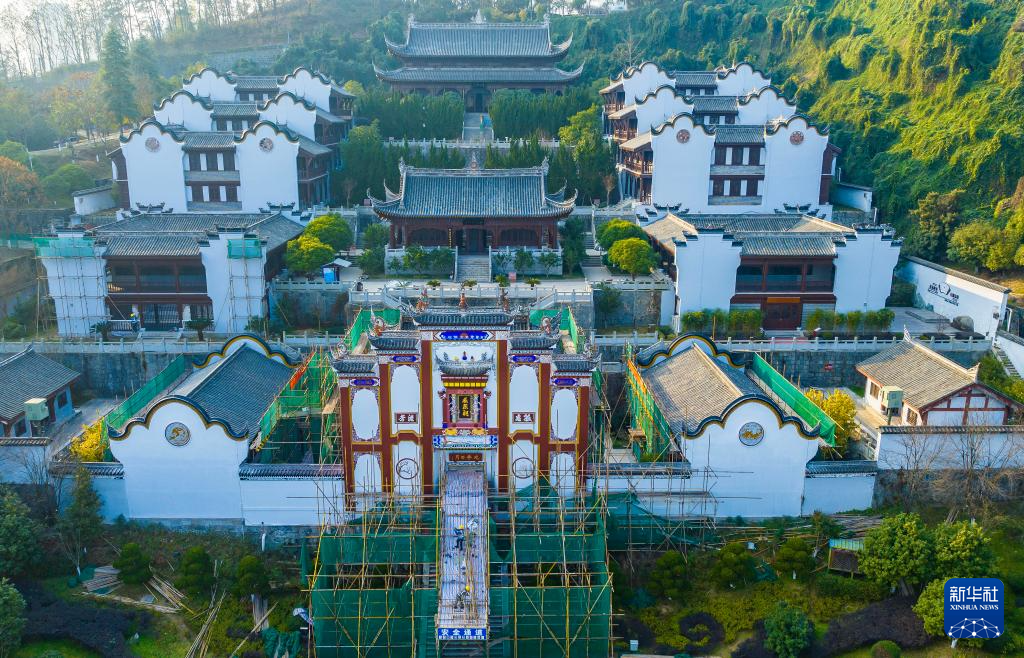 12月24日,工人在秭归县屈原祠山门前拆除脚手架(无人机照片)。新华社发(郑家裕 摄)