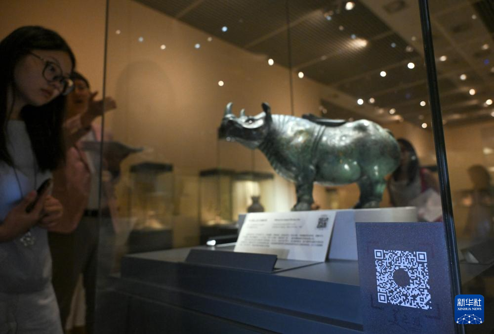 这是7月21日拍摄的错金银云纹青铜犀尊与“美之道”二维码。新华社记者 金良快 摄