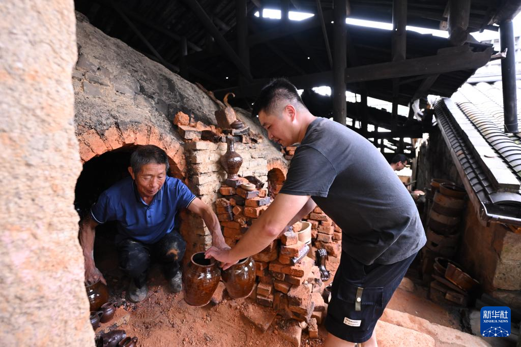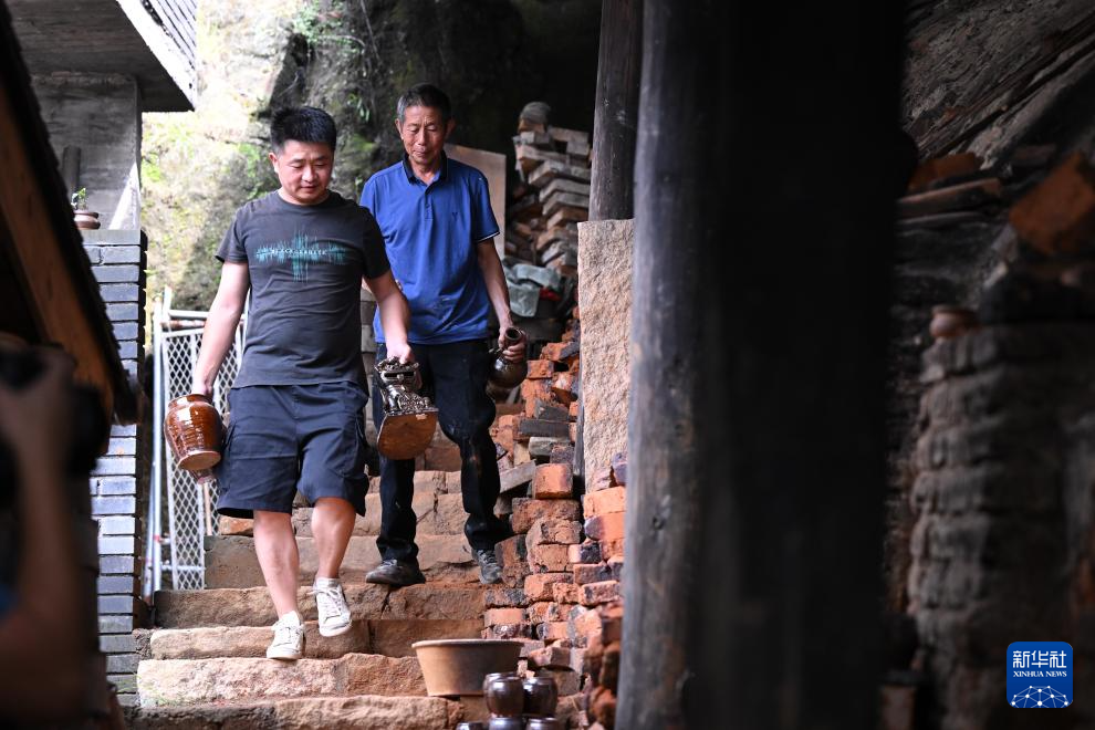 7月18日,在周宁县浦源镇萌源村月山古龙窑,肖家涨(左)与儿子肖永灿从龙窑内取成品硋器。新华社记者 姜克红 摄