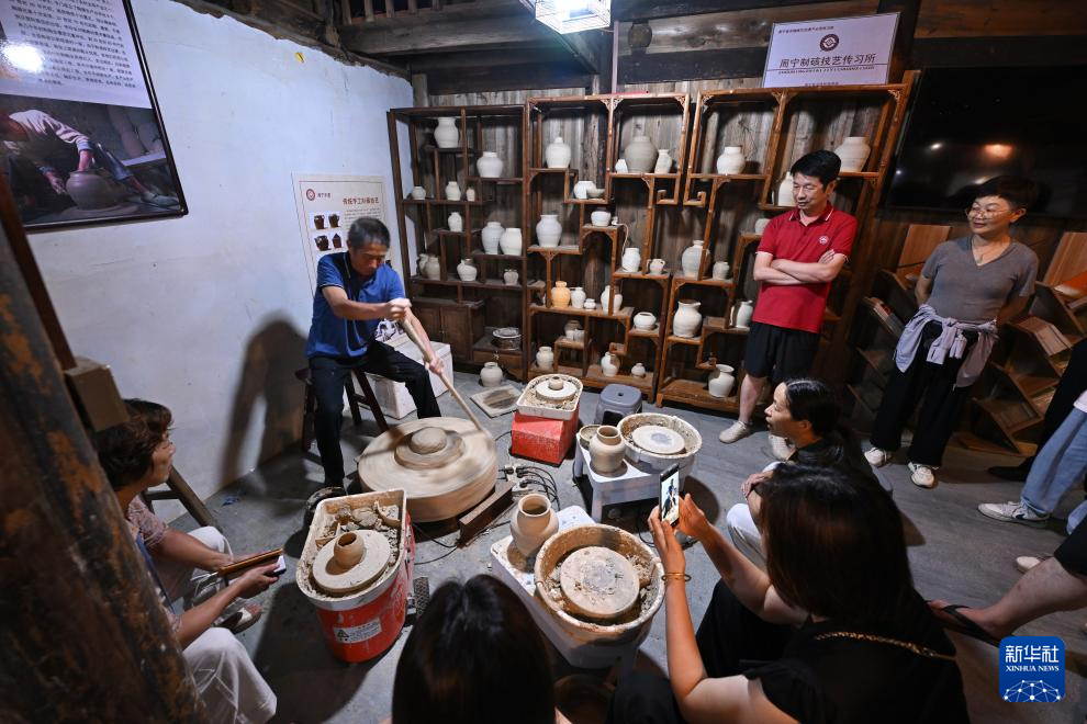 7月17日,在周宁县浦源镇鲤鱼溪景区民俗馆,肖家涨在为游客表演传统制硋技艺。新华社记者 姜克红 摄
