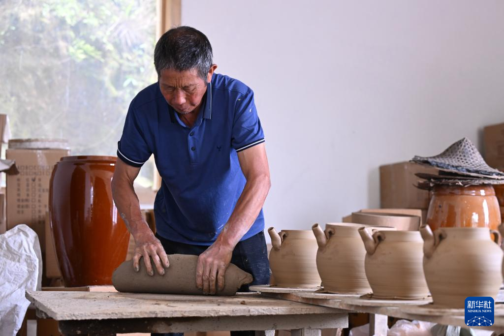 7月18日,在周宁县浦源镇萌源村月山古龙窑制作间,肖家涨在制作传统硋器。新华社记者 姜克红 摄