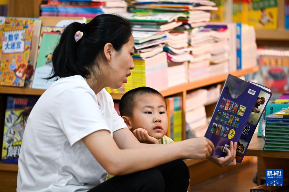 7月27日,一位家长与小朋友在呼和浩特市青城阅立方书店阅读。新华社记者 李志鹏 摄