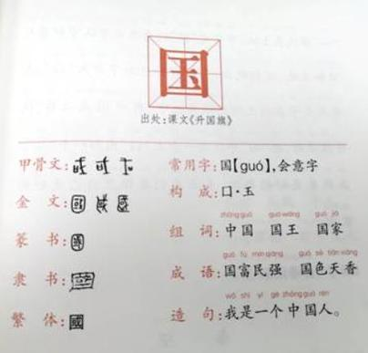 梁相斌以该书开篇 “国”字为例介绍,目前发现最早的“国”字是出现在商朝甲骨文上的“国”(或)字。甲骨文“国”字由“戈”字、“囗”字和“一”字构成。戈是古代一种兵器,代表军队。“囗”字是象形字,像人的嘴巴张开的样子,代表人口。“一”字代表土地。甲骨文“国”的意思是军队守护着人口和土。周朝晚期,“或”字外边加了个大“囗”,表示周天子在领土四周派兵把守。新中国成立后,汉字改革时,把“国”字改为一个大“囗”内加一个“玉”。玉代表美好的事物,表示我们要保卫自己美好的家园。