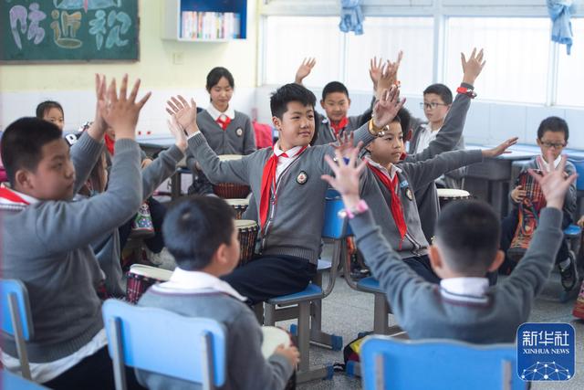 5月16日,湖北省荆州市沙市大赛巷小学学生在活动室表演非洲鼓。新华社记者 肖艺九 摄