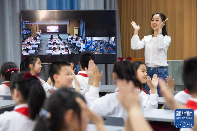 5月16日,在湖北省荆州市沙市大赛巷小学,学生通过“空中课堂”与偏远乡镇的丫角小学一起进行韵律操活动。新华社记者 肖艺九 摄