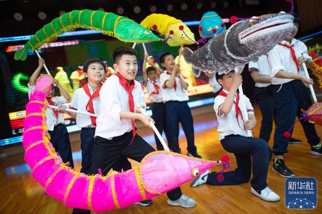 5月16日,湖北省荆州市沙市大赛巷小学学生在课后表演“五虾闹鲇”。新华社记者 肖艺九 摄