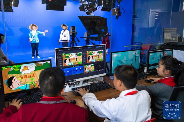 5月16日,在湖北省荆州市沙市大赛巷小学校园电视台,学生在课后进行节目的录制和编排实践。新华社记者 肖艺九 摄