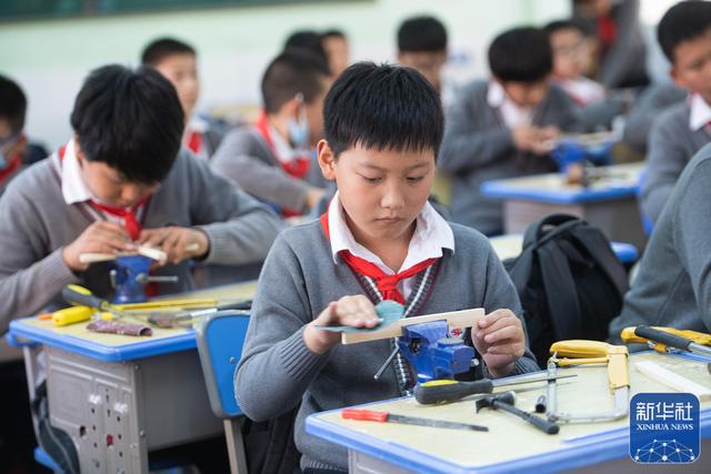 5月16日,湖北省荆州市沙市大赛巷小学学生在课后进行木工练习。新华社记者 肖艺九 摄