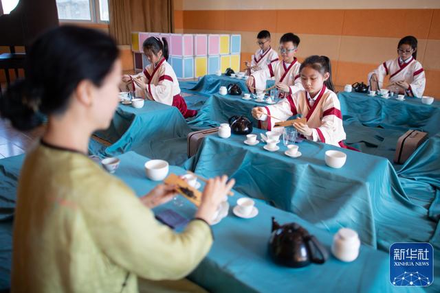 5月16日,湖北省荆州市沙市大赛巷小学学生在活动室练习茶艺。新华社记者 肖艺九 摄