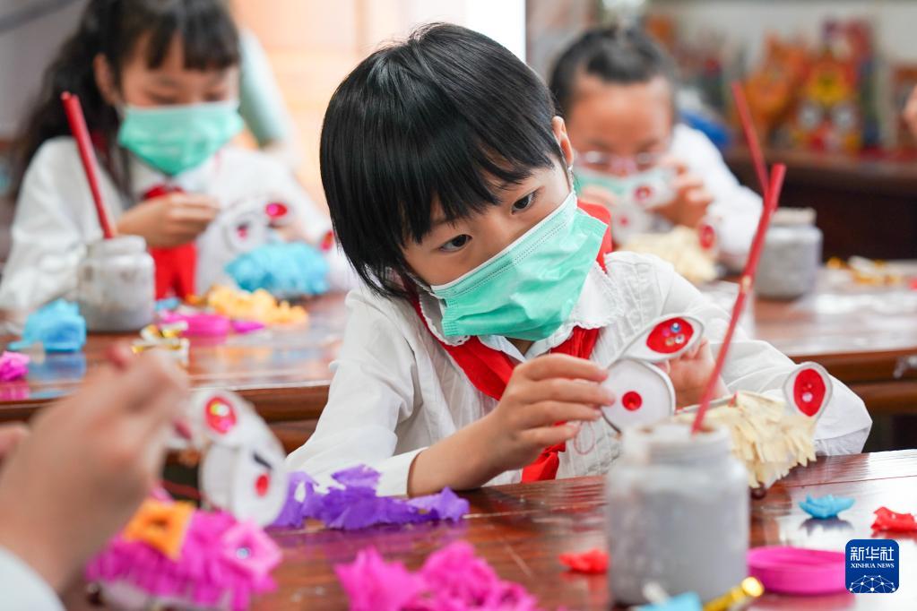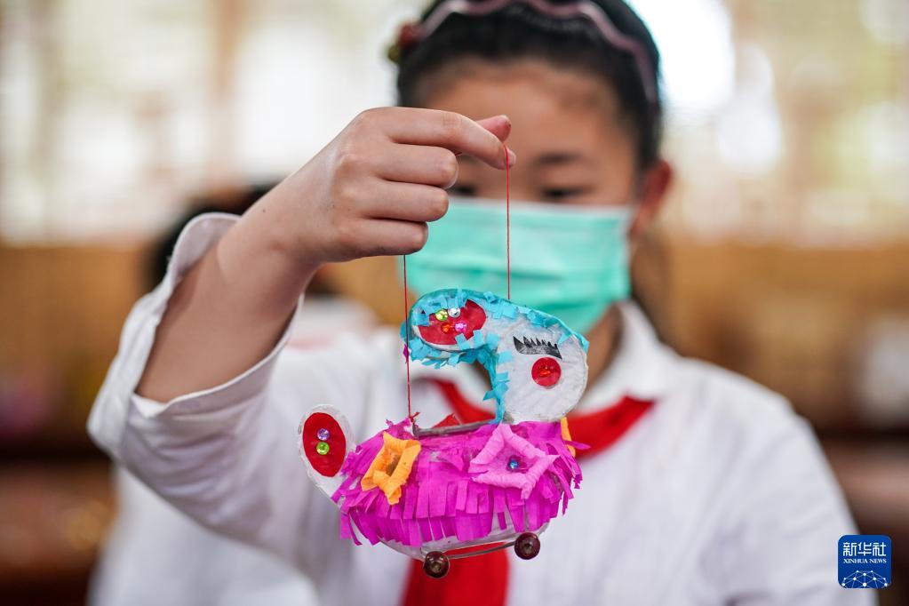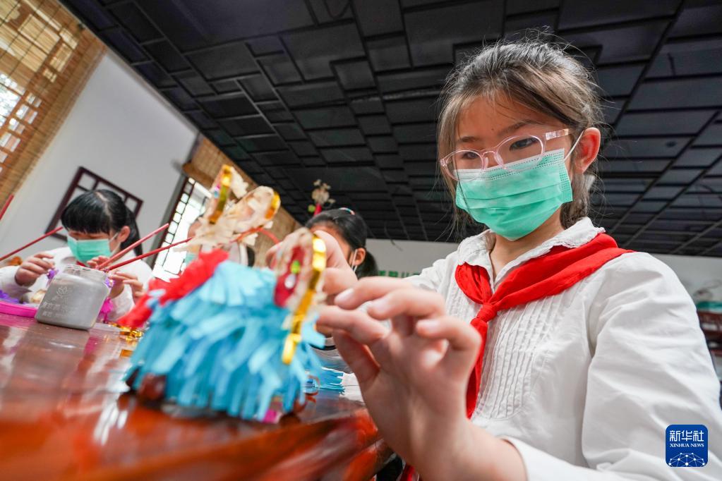 5月27日,在南京市秦淮区武定新村小学,学生在做“兔子灯”。新华社记者 李博 摄。
