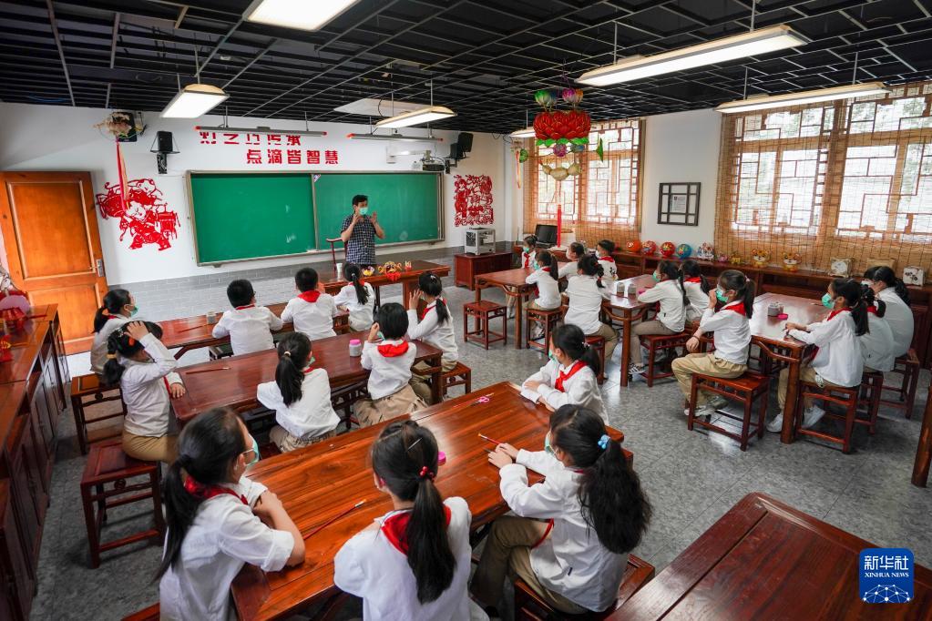 5月27日,在南京市秦淮区武定新村小学,秦淮灯彩艺人、国家级非物质文化遗产代表性传承人顾业亮在为学生上课,讲解秦淮灯彩的历史。新华社记者 李博 摄。