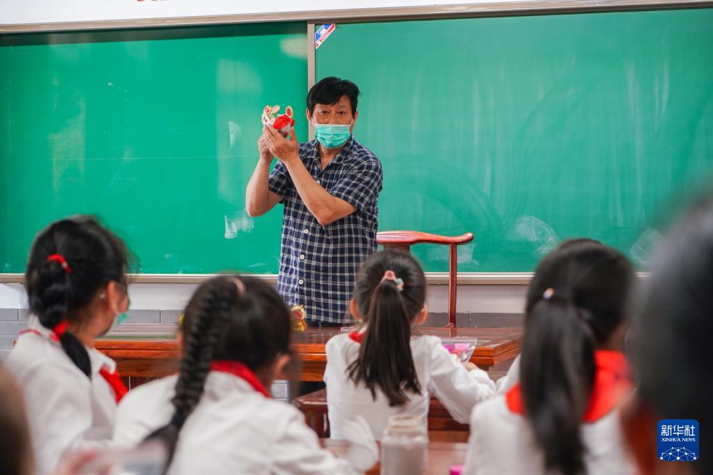 5月27日,在南京市秦淮区武定新村小学,秦淮灯彩艺人、国家级非物质文化遗产代表性传承人顾业亮在为学生上课,讲解制做“兔子灯”的步骤。新华社记者 李博 摄。