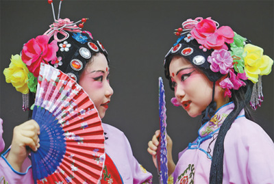 参加夏令营的同学在五里树小学小剧场表演京剧。