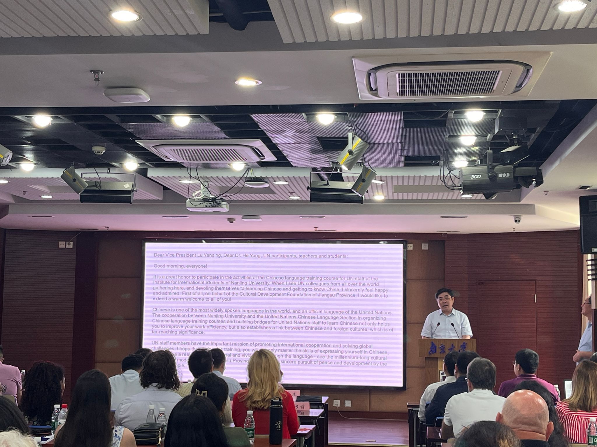7月21日上午,南京大学第19期联合国职员中文培训班开班仪式在海外教育学院曾宪梓楼报告厅隆重举行。南京大学副校长陆延青、江苏省文化发展基金会理事长姜龙、联合国来华项目负责人何勇出席仪式并致辞。
