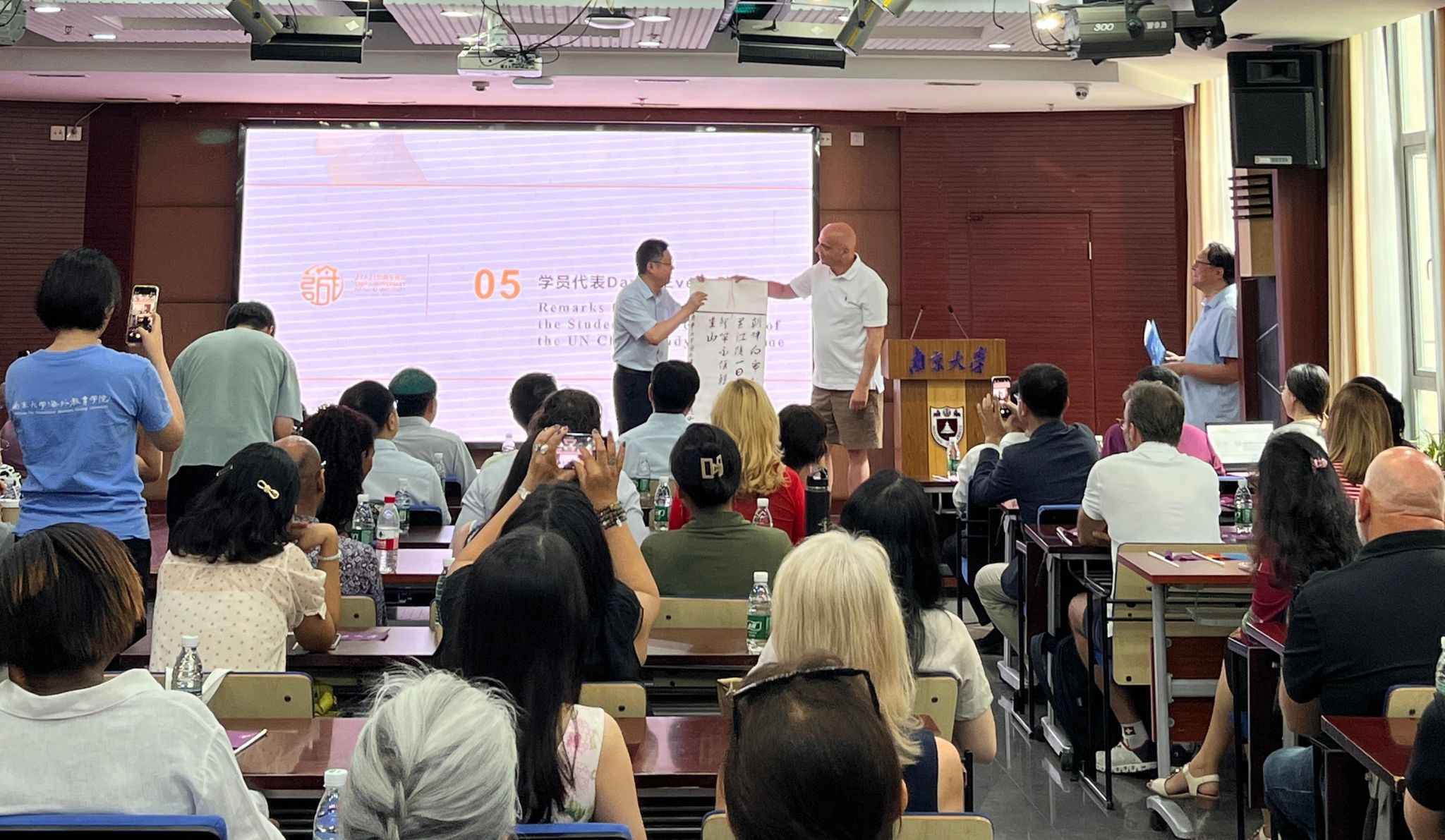姜龙在致辞中强调,中文是联合国官方语言及全球使用最广泛语言之一,此项目为联合国职员搭建了高效学习中文的平台,并助力其工作能力提升。基金会有志于在中外文化文明的交流与互鉴方面展作为、做贡献,将联合南京大学海外教育学院,在语言培训基础上融入江苏千年文脉与现代活力体验。最后,他祝贺南大海外教育学院第19期联合国职员中文班取得圆满成功。