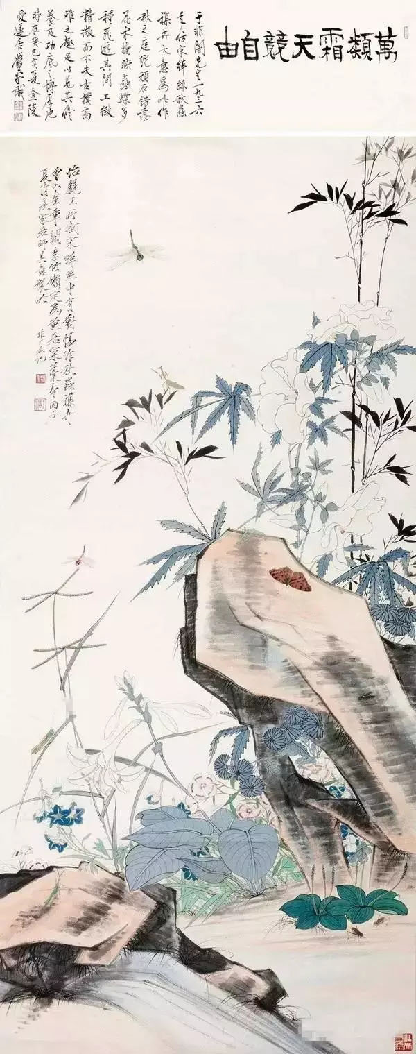 这件作品在工笔作品中堪称大件,庭院顽石错落,玉簪,牵牛,新竹穿插其间,点缀着蜻蜓,蚱蜢,蝴蝶等动物,一片秋意盎然。不但画面典丽繁复,而且对象的布置繁简得当,形象刻画精微生动,线条劲挺有力而准确严谨,极具节奏感,设色清丽、匀净而典雅,富有宋缂丝画的装饰性,有很强的古朴明丽的意味。他抓住了对象瞬间的动态特点,如两个蜻蜒或停或飞的动态极为准确传神。