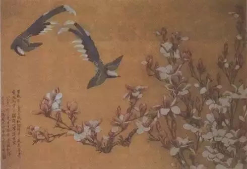 《木笔山鹧图》中,于用酣畅挺拔的“瘦金书”题写了一首白居易的诗《题灵隐寺红辛夷花一戏酬光上人》:“紫彩笔含尖火焰,红胭脂染小莲花。芳情香思知多少,恼得山僧悔出家” ,颇见其趣。其书法配其工笔花鸟,古意更浓。