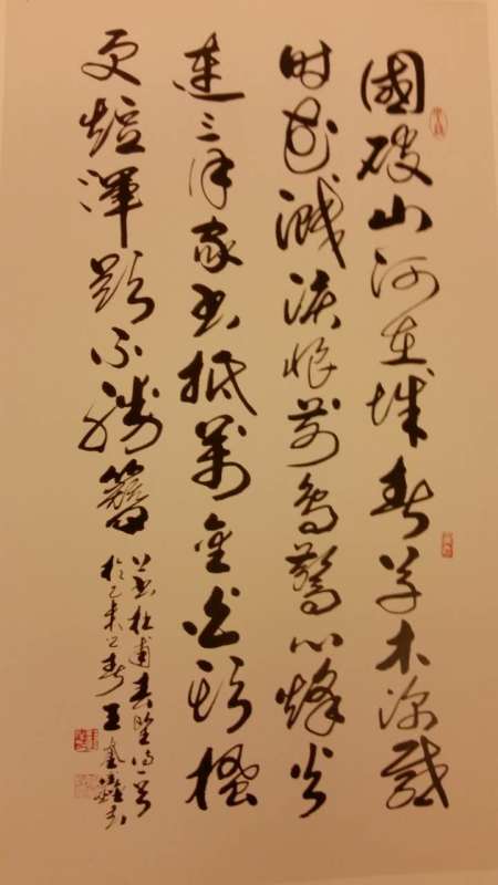 明代项穆《书法雅言》中,有“顿之以沉郁,奋之以奔驰,奕之以翩跹,激之以峭拔。或如篆籀,或如古隶,或如急就,或如飞白,随情而绰其态,审势而扬其威。每笔皆成其形,字各异其体。”欣赏他的作品,我们能够感觉到王铎的连篇气势,于右任的简约援括,谢无量的随意自然。“书如其人诗言志”,这是著名书画艺术大师范曾为王奎鑫先生书法所题写的评价。信手拈来而神韵豪迈,风范大气儒雅,意境自然高远。