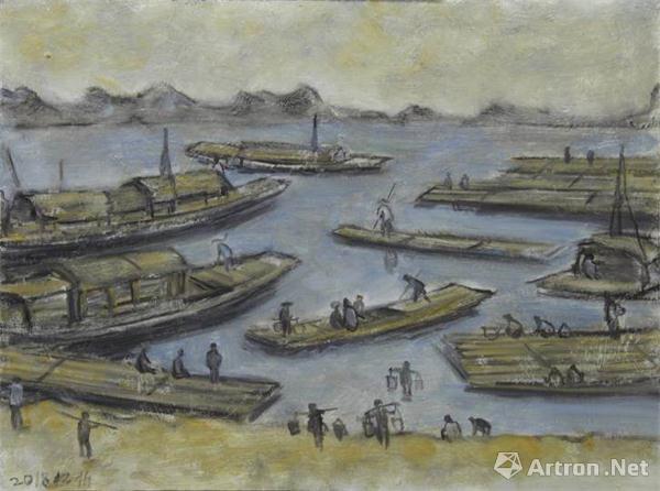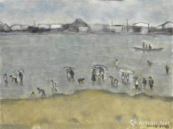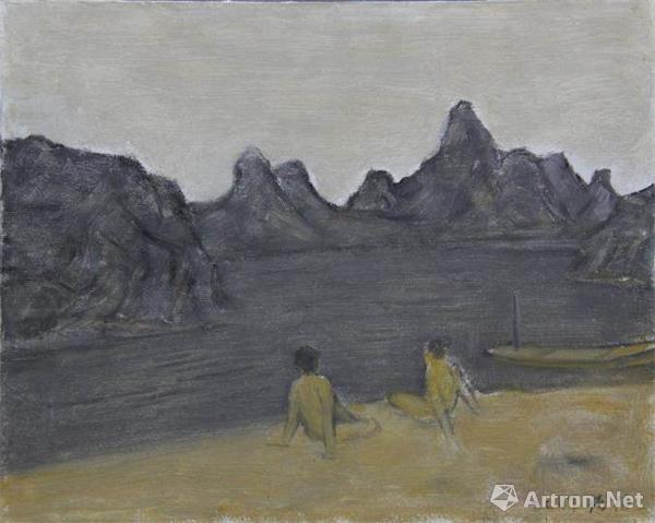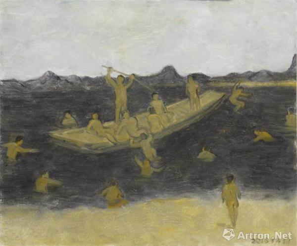 在赵松柏所绘的作品中,多以桂林山水、市郊街口、老屋厂房、游泳捕鱼等场景为主,似乎在回溯记忆长河、聚焦局部记忆,大部分影像有赖于他儿时生活场景的还原,归乡情绪浓郁,就像是“回放电影”一样既真实又虚幻。作品语言偏重水墨特性,撷取拼合的黑灰块面与简约勾勒的轮廓线复原了某种时空情境,由此携带出赵松柏某种主观特定观念的追寻,有种“似与不似”的文人画精神,不仅摒弃了“具象”“抽象”等西方油画造型风格技巧对他的羁绊,还更为自由地映现意象油画的“古意”魅力。因此,“古意”也成为他的作品令人难忘的视觉美感和文化内涵。