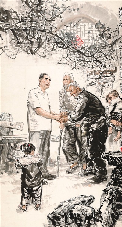 值得一提的是,在主题性美术创作中,周思聪的中国画《人民和总理》、沈尧伊的连环画《地球的红飘带》、李伯安的水墨巨制《走出巴颜喀拉》、冯远《世纪智者》、赵奇《京张铁路·詹天佑和修筑它的人们》等作品,都能在宏大叙事主题下展现出鲜明个性特征,承载着新的时代气息。近10余年来,与民族、国家、历史、社会现实相关的主题性美术创作大工程接连上马,规模大,投入大,社会影响也大。2009年9月,中国美术馆的“国家重大历史题材美术创作工程作品展”,106件作品中有中国画作品40件。唐勇力《新中国的诞生》、袁武《东北抗联》等,是这项工程中的力作。2016年,历时5年的中华文明历史题材美术创作工程完成,146件作品中近四成是中国画巨幅作品。其中有宋雨桂《黄河雄姿》、林海钟《鉴真东渡》、任惠中《文景之治》,唐勇力《盛唐书画艺术》、林蓝《<诗经>——长歌清唱》等。这批新作体现出美术家更注重发掘中华文化资源,承传中国绘画传统,表现题材和语言手法也更趋多样化。画家们再不像前几年那样简单化借用传统的符号,而是尽力让民族艺术传统与当代精神有机整合融通。中国画抒情性、写意性的特征被合乎情理地融入了历史题材人物画创作语言中。