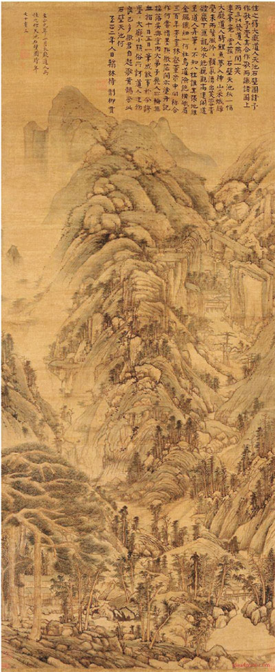 “余曾闻之先奉常云,在京江张子羽家,见大痴秋山笔墨设色之妙。虽大痴生平不易得,以未获再见为恨。时移世易,此图不知何往矣。余学画以来,常形梦寐,每当盘礡,于此系揣冀其暗合。如水月镜花,何从把捉,只竭其薄技而已。”